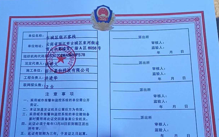 關(guān)于麗江和府酒店有限公司英迪格酒店電子監(jiān)控安防合格證下證通知