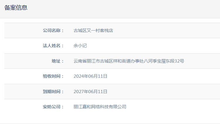 關于麗江和府酒店有限公司英迪格酒店電子監控安防合格證下證通知