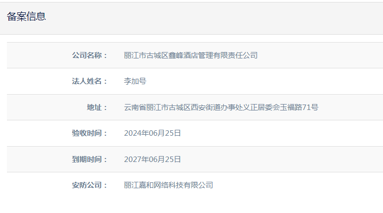 關于麗江市古城區鑫峰酒店管理有限責任公司電子監控安防證下證通知