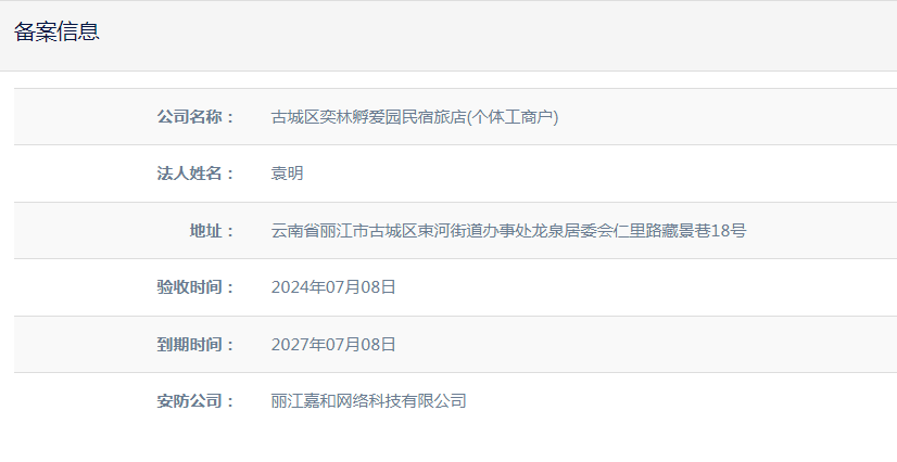 關于古城區奕林孵愛園民宿旅店(個體工商戶)電子監控安防合格證下證通知