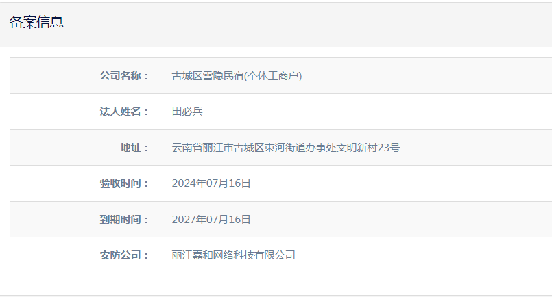 關于古城區雪隱民宿(個體工商戶)電子監控安防合格證下證通知
