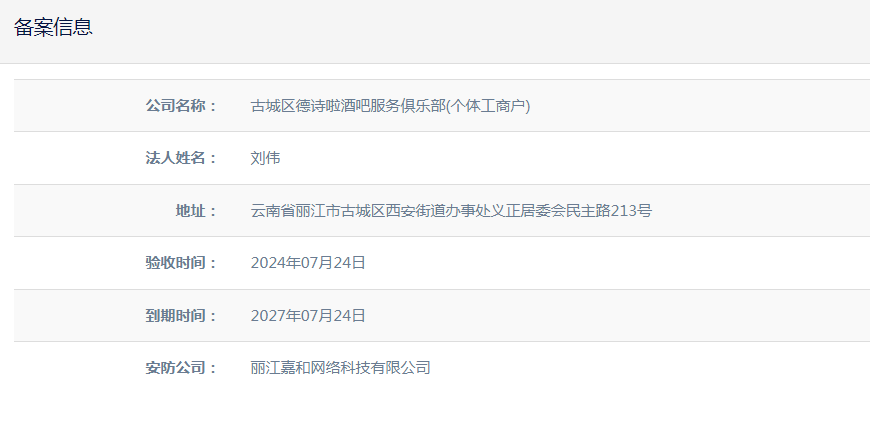 關于古城區德詩啦酒吧服務俱樂部(個體工商戶)電子監控安防合格證下證通知