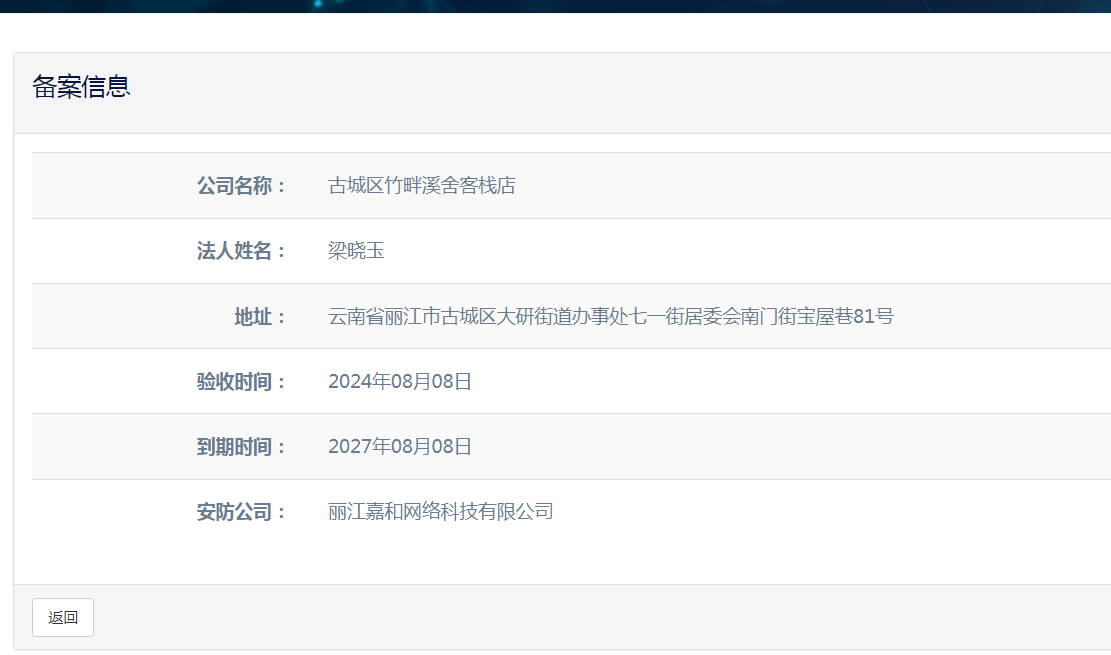 關于古城區竹畔溪舍客棧店電子監控安防合格證下證通知