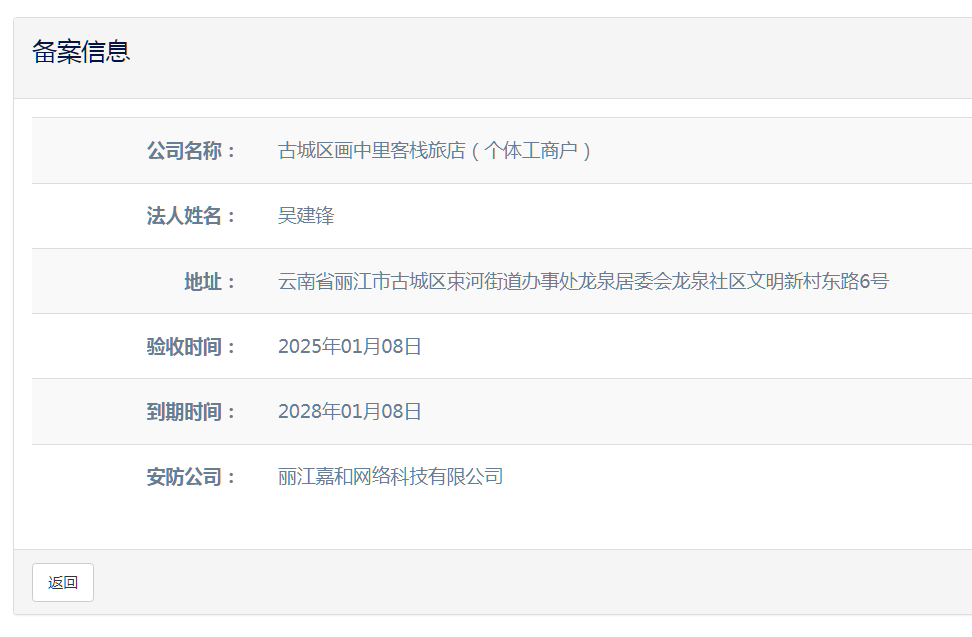 關于古城區畫中里客棧旅店(個體工商戶)電子監控安防合格證下證通知