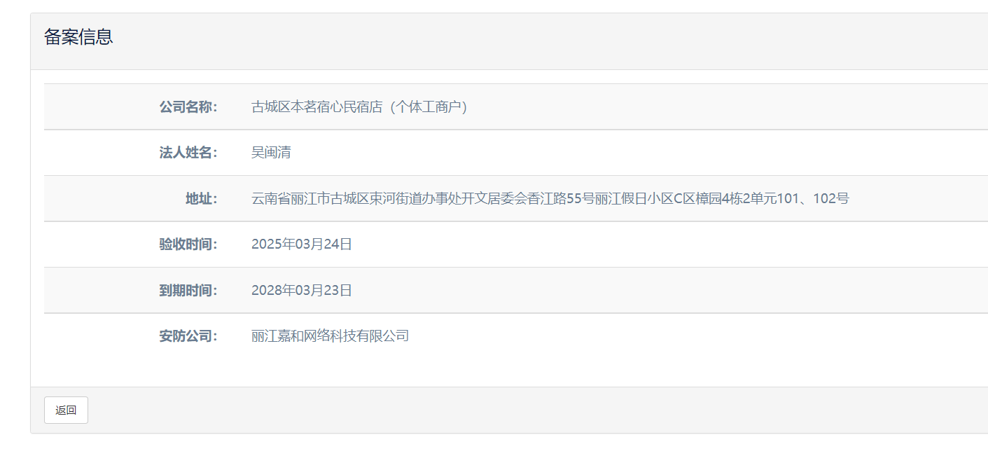 關于古城區(qū)本茗宿心民宿店(個體工商戶)電子監(jiān)控安防合格證下證通知