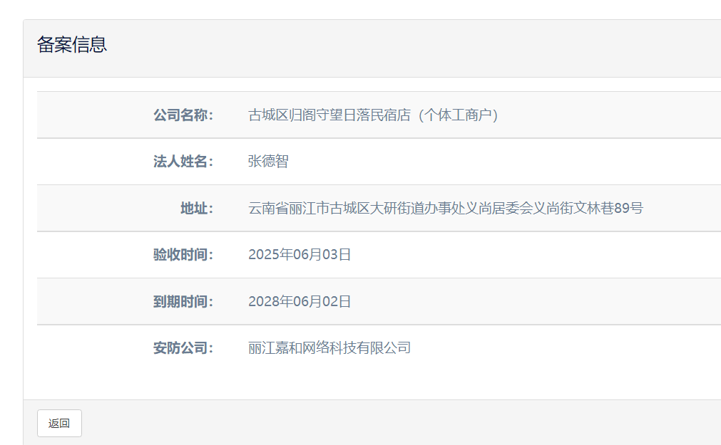 關(guān)于古城區(qū)歸閣守望日落民宿店(個(gè)體工商戶)電子監(jiān)控安防合格證下證通知