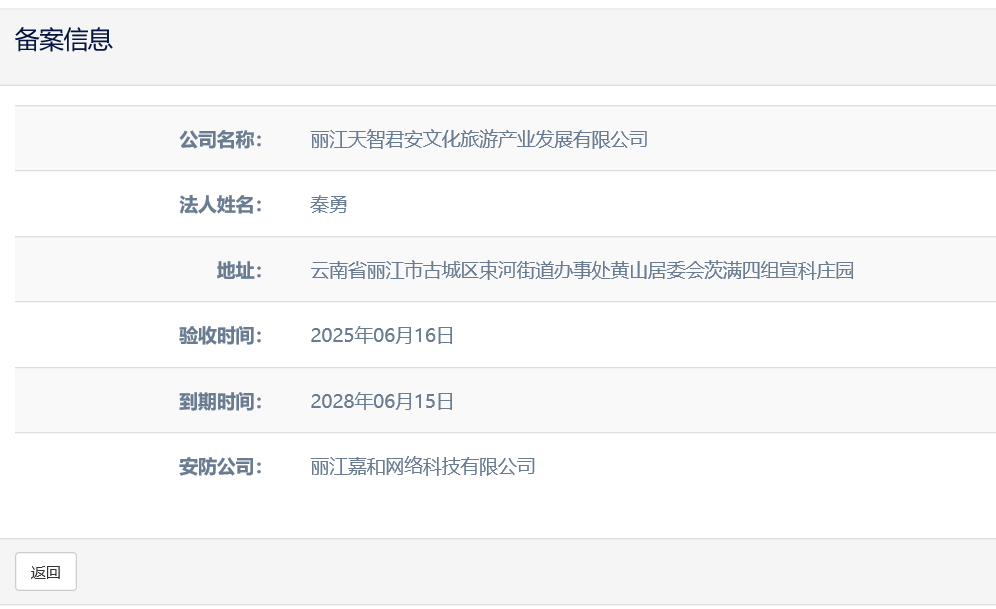 關于麗江天智君安文化旅游產業發展有限公司 電子監控安防合格證下證通知