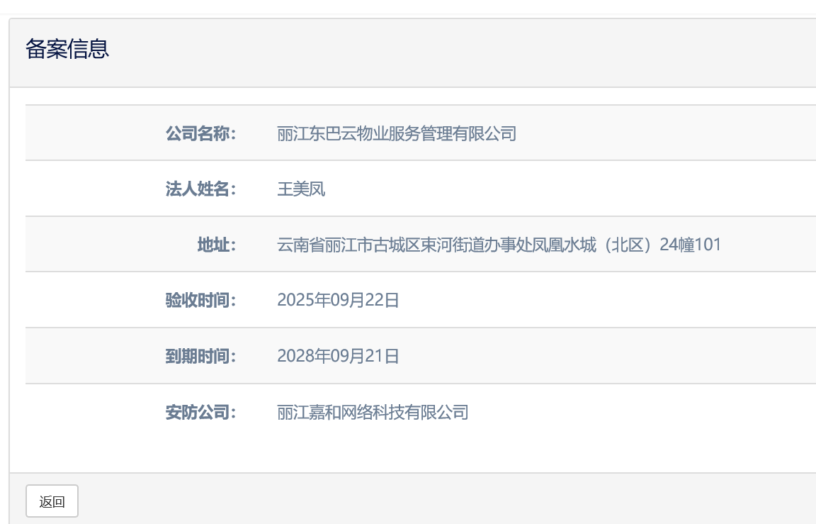 關于麗江東巴云物業服務管理有限公司電子監控安防合格證下證通知